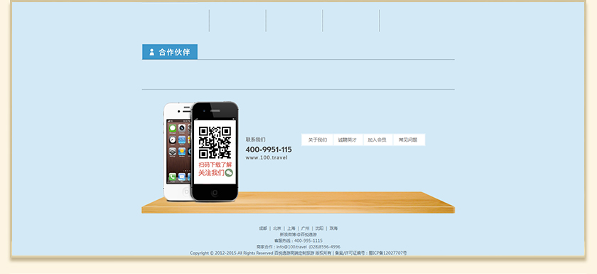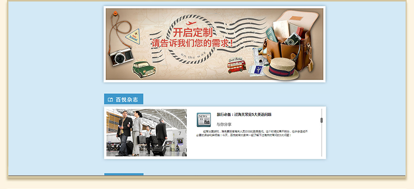Project Description 百悦逸游于2012年初由二位资深的旅行家创办,是成都传媒集团旗下成都新闻国际旅行社有限公司的高端旅游品牌,总部位于成都高新区天府大道中段美年广场。在百悦逸游成立之前,创始团队亲自到全球三十多个国家实地考察,带着第一手的资讯和执着的信念创立了中国西部第一家真正意义上的私人定制旅行机构。百悦的旅行不是跟团挤大巴,不是十天去十个国家,更不是没完没了的... Official website address 松原http://www.100.travel I want to share